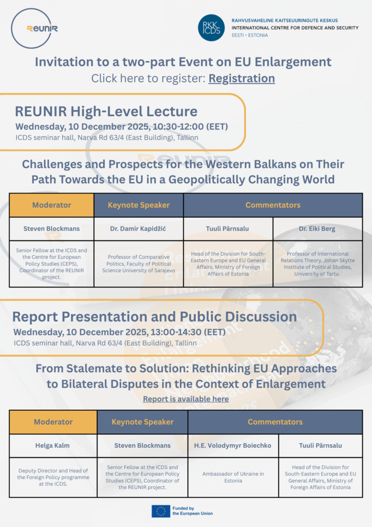 The REUNIR Horizon Europe project, together with the International Centre for Defence and Security (ICDS), is pleased to invite you to a two-part event dedicated to the future of EU enlargement and the geopolitical dynamics shaping the Western Balkans.